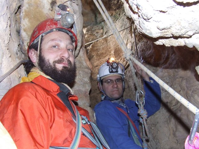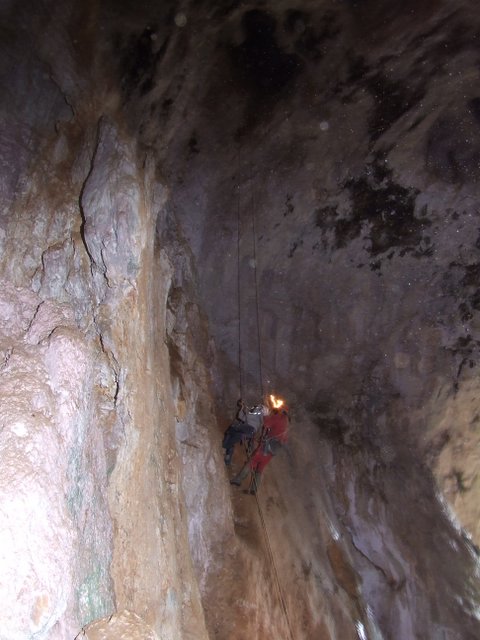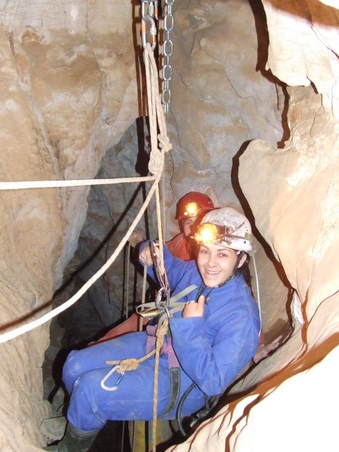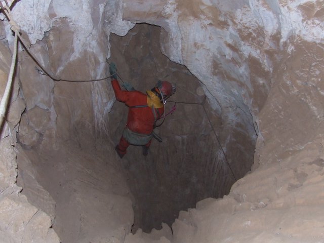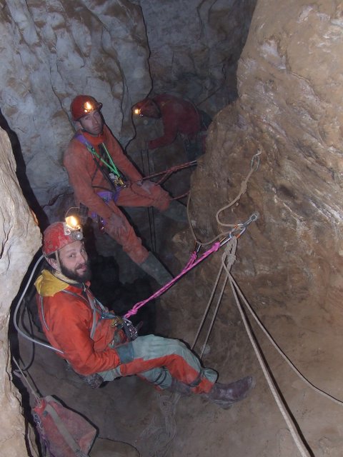 On progresse quelques mètres en opposition dans sa partie supérieure pour rattraper le bas du méandre. Après un rétrécissement, la configuration devient verticale et le grondement de la rivière souterraine se fait entendre.